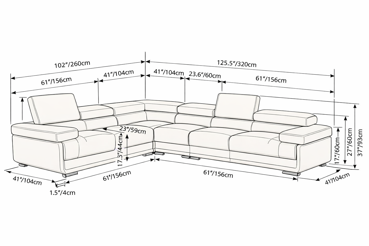 Designed for flexibility, the black leather sectional includes an interchangeable armless chair that allows you to easily configure the longer side to the left or right, or use the armless piece separately as an accent seat. Adjustable headrests provide personalized comfort, while high-density foam seating ensures lasting support. Finished with subtle metal legs, this sectional brings modern elegance and functionality to any living space.